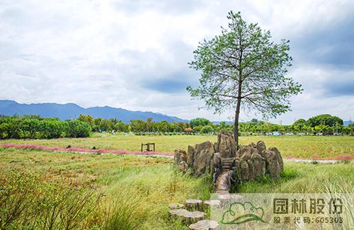 旁邊的一個(gè)樹島,用柴火和鋼管做出“鳥巢”形狀,雖稍顯“凌亂”,但卻顯得分外自然;再前方的一個(gè)樹島,增加“五指”塑石景觀,遠(yuǎn)遠(yuǎn)看去,好像一只大手托舉著大樹;穿過田間小路,來到幾棵大樹組成的樹林,錯(cuò)落有致的景石形成一個(gè)自然的圍合空間,林間小路用舊木頭鋪成,道路兩邊用紫色鼠尾草、刀茅等植物巧妙搭配出清新的花境,坐在樹下的石頭上小憩,看著孩子們?cè)谧分疰覒?,仿佛回到了兒時(shí)和小伙伴在村口大樹下游玩打鬧的時(shí)光,關(guān)于故鄉(xiāng)的回憶充盈在心間。