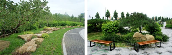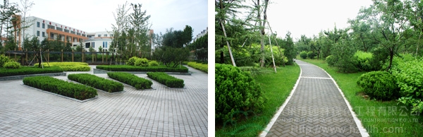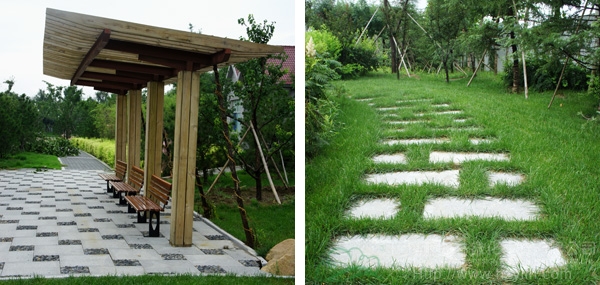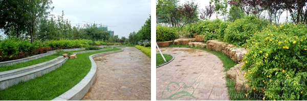 而在道路十字路口的節(jié)點(diǎn)處,則主要是用10cm×10cm的小花崗巖鋪地,鋪出來的路面整潔、平坦,看似簡(jiǎn)單,實(shí)則對(duì)施工技術(shù)要求相當(dāng)高。草坪中的地面鋪裝,則采用花崗巖汀步,用錯(cuò)縫鋪裝法,兩塊花崗巖之間用草皮鑲嵌,就像給每塊花崗巖鑲了一道綠邊,與旁邊的草坪和諧地融為一體。貫穿整個(gè)工程的游憩步道,全部采用“人字形”的鋪裝方法,中間用透水磚、兩邊以花崗巖鑲邊,透水磚價(jià)格不高,用以鑲邊的花崗巖是利用了鋪裝中剩余的邊料,雖然用料簡(jiǎn)單,但通過對(duì)技術(shù)的嚴(yán)格要求,鋪出的路面卻整潔而不失韻味,是一種實(shí)用、環(huán)保、節(jié)約的做法。
