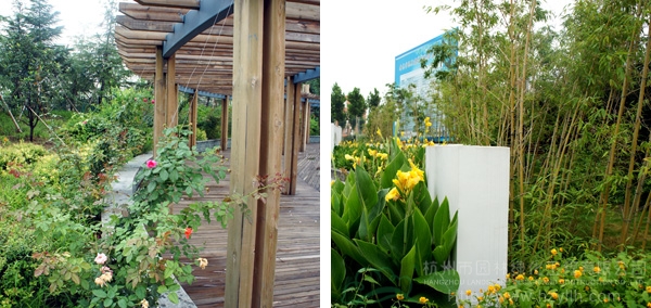 每個(gè)景觀節(jié)點(diǎn)上,植物的配置方法都是不一樣的,如在下沉廣場(chǎng),主要是以小龍柏、金葉女貞等小灌木片植成方形或弧形,間或點(diǎn)綴石楠、梅樹,看起來規(guī)整、簡(jiǎn)潔;而在設(shè)計(jì)風(fēng)格為江南園林的南廣場(chǎng)上,是將貴重的造型油松單植,通過不同的組合,形成三個(gè)風(fēng)格相近的綠島,周邊種植美人蕉、玉簪、竹子,并砌起白墻,上面開圓形拱門或圓窗,散發(fā)出詩意江南的靜謐和婉約氣息?!坝雾降朗秦灤┱麄€(gè)景觀的軸線,為了形成曲徑通幽的景觀效果,我們將對(duì)植、孤植、叢植都多種方法結(jié)合運(yùn)用,特別是在三叉路口,多種植海棠、櫻花、杏花等,一方面,花開的時(shí)候,綠葉間繁花點(diǎn)點(diǎn),會(huì)吸引人們不斷向前探尋更多的美景;而花落之后,茂密的枝葉又形成隱隱約約的視覺感受,前方轉(zhuǎn)過彎后風(fēng)景什么樣,又讓人很想去看看?!备呓?jīng)理笑著說。