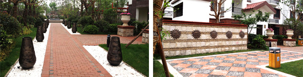 據(jù)楊經(jīng)理介紹,紫金東郡小區(qū)里的鋪裝材料主要以橙紅色的燒結(jié)磚和仿古磚為主,燒結(jié)磚具有承重量大和隔聲性強的特點,是小區(qū)園路鋪裝的優(yōu)良選擇,此外,紅色又與建筑的整體色調(diào)相搭配,有種渾然一體的效果感;而仿古磚除了具有防水、防滑、耐磨等特性外,還具有獨特的古典韻味,更能營造出歲月的滄桑和厚重感。在鋪裝方式上,有的是道路中間用橙紅色的燒結(jié)磚,兩邊鋪設白色的石子,營造一種居家庭院的溫馨感;有的是正方形的仿古磚與黑色的石子,一紅一黑,相映成趣;還有的用白色的仿古磚作道路兩側(cè)的點綴,風格自成一體。純美的色彩、流暢的線條、些微的暖調(diào),不同的道路上別具特色的圖案,使人走上去踏實、安穩(wěn)而又感古樸、雅致,成為不斷蜿蜒的腳下風景。