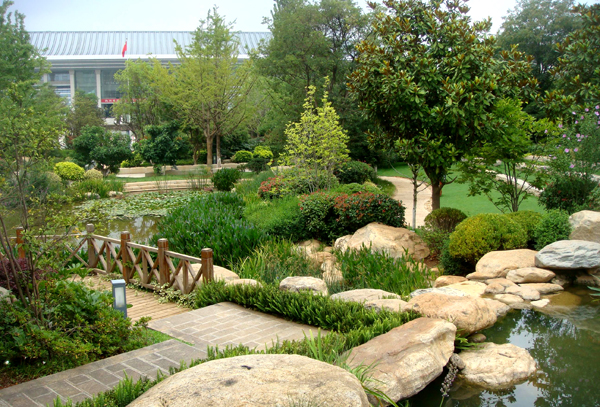 自然式駁岸讓人工湖更具野趣,大小不一的天然景石成組擺放。從岸邊到水中,陸地植物、濕地植物、水生植物依次“排列”,以最淳樸的方式演繹著自然規(guī)律。水邊大量栽種柳樹,輕柔的枝條隨風(fēng)搖擺,旁邊搭配清香木、雞爪槭等耐水濕喬、灌木,豐富的葉色、優(yōu)美的姿態(tài)將普通的湖岸裝飾一新。對于湖面較大的部分,僅在湖體四周以塊狀方式種植水生植物或濕生植物,中央?yún)^(qū)域則不種植水生植物,以擴大空間感,使得樹木、建筑物能夠形成完整的倒影,成就優(yōu)美的“水中畫”。