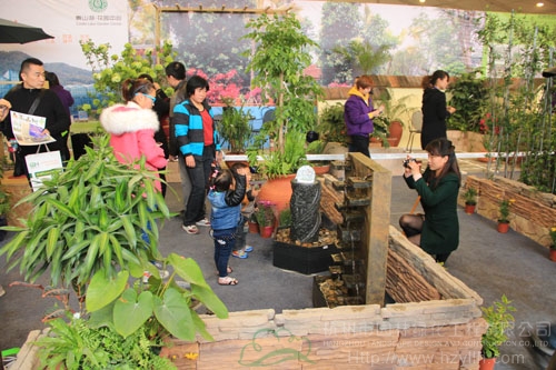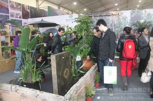 22日上午,浙江(中國)花木城的展廳里人潮涌動(dòng),自然的濕地景觀,古樸的庭院,美輪美奐的花境園,超大的“會(huì)呼吸”的綠墻……風(fēng)格迥異的情景展示讓人目不暇接。而在展區(qū)的西北角,是一個(gè)綜合型展區(qū):一排排透明的玻璃瓶里展示著研發(fā)中心的組培苗;整齊擺放的穴盤里是生產(chǎn)中心的扦插苗;后面的是運(yùn)營中心造型優(yōu)美的組合盆栽、園藝飾品、盆器等;中間的庭院展示區(qū),低矮的墻角花壇里,一蓬紅艷艷的杜鵑,向人們吐露著春的美麗,生動(dòng)的流水點(diǎn)綴一旁,引得大人和孩子爭相上前拍照;最里面一個(gè)木平臺(tái)上擺放著一套戶外家居,既是采供中心人員的洽談區(qū),也是景觀的一部分。這,就是杭州市園林綠化工程有限公司的展區(qū)。