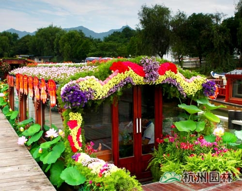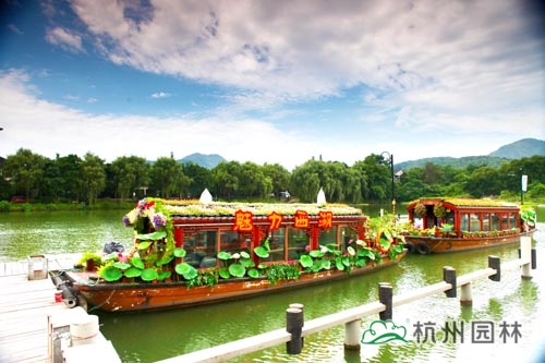 藝術(shù)節(jié)期間,首次在西湖湖面上配置6艘荷花花船,極大地提高了荷花節(jié)的觀賞性和趣味性,成為西湖中一道流動的荷花美景。其中,由杭州市園林綠化股份有限公司設(shè)計制作的“魅力西湖”荷花游船,將插花技藝與園林布景手法有機結(jié)合,用康乃馨、勿忘我、太陽花等與荷花組景,既突顯了“主角”荷花的秀麗、典雅,又使整艘船的色彩明艷豐富,將熱鬧的節(jié)日氛圍巧妙烘托。