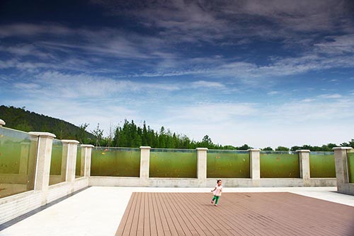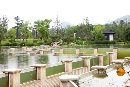 沉水廊道:總長148米,其中,北面60米,南面88米,整個廊道內(nèi)湖水域面積達1.1萬平方米,堪稱中國廊道景觀之最。廊道兩側以透明的亞克力玻璃隔斷湖水,通過先進的水凈化系統(tǒng)對湖水進行循環(huán)凈化處理。遠觀沉水廊道,宛如蛟龍蜿蜒盤桓于湖面之中,將整個云龍湖一分為二,猶如太極中的陰陽兩儀,充分體現(xiàn)了道家文化;兩頭又與玉珠島呈二龍戲珠之勢。游人行走其中,可以欣賞各種魚類嬉戲于水生植物之間,仿佛置身于水族館之中,同時又可以觀賞到玉珠島的奇石、奇花與奇樹??芍^是匠心獨運。