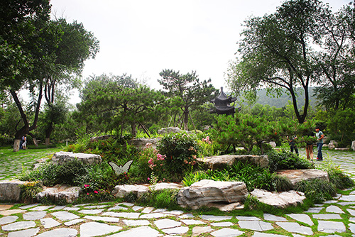 特別是鵠鳴谷,充分利用原有地形,在制高點建立六角重檐亭,即珠山亭,形成全區(qū)的觀景點,地面用80mm厚的灰石板自然面亂鋪,縫隙50mm左右,中間種植草皮,通過增加其他的植物配置,與原有的榆樹、法桐等大樹一起,形成古樸、清幽、自然的原生態(tài)景觀群落,成為景區(qū)中的一大亮點。
