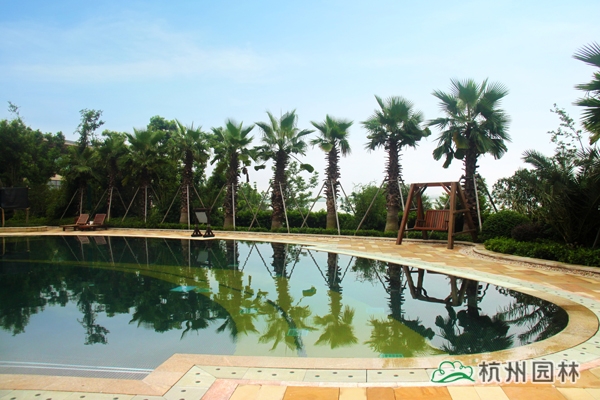 露天泳池區(qū)景觀獨(dú)具特色,選用華棕、棕櫚、布迪椰子、加拿利海棗等熱帶植物作為主景,營(yíng)造出簡(jiǎn)約大方、層次分明的濃郁熱帶園林風(fēng)情。為了提高這些熱帶植物的成活率,降低后期的養(yǎng)護(hù)成本,這批植物都經(jīng)過(guò)馴化,較能適應(yīng)吳江的氣候條件。該區(qū)面積較大,從酒店的觀景平臺(tái)上往下看,泳池中間的小島就像彎彎的小船,仿佛要順流而下;水質(zhì)清澈見(jiàn)底,水底大面積的藍(lán)色和黃色玻璃馬賽克,營(yíng)造出波光鱗鱗的效果,偶有微風(fēng)吹來(lái),水面蕩起陣陣漣漪,流動(dòng)的線條瞬間充滿了生機(jī)和活力,整個(gè)泳池仿佛都動(dòng)了起來(lái)。岸邊的植物高大茂密,郁郁蔥蔥,透過(guò)樹(shù)叢的間隙,浩渺無(wú)邊的太湖水系與遠(yuǎn)處的天際線連接在一起,恍然之間,好象是來(lái)到了充滿陽(yáng)光、海浪、沙灘的南國(guó)熱帶海域,心情的舒暢不言自喻。
