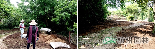 為增強植物后期長勢,現場采用杭州市園林綠化股份有限公司自主研發(fā)生產的易豐綠化有機基質進行土壤改良,改良配比為易豐綠化有機基質體積比40%摻入原土20cm。采用翻地→撒1/2基質→二次翻地→撒1/2基質→澆水下沉→三次翻地模式完成土壤改良。改良后的花園入口及內部空間感十足。