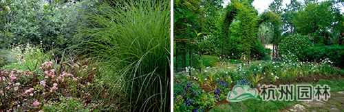 擋墻后采用柳葉馬鞭草+翠蘆莉分帶種植,并點綴穗花牡荊的手法,形成錯落有序、整齊卻不單調的英式鄉(xiāng)村院落景觀。
