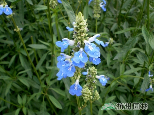 天藍(lán)鼠尾草,花天藍(lán)色,開(kāi)花植株高達(dá)1米5,花期春季。喜溫暖,陽(yáng)光充足的環(huán)境,不擇土壤,耐干旱,但不耐澇,特別喜石灰質(zhì)豐富、或沙性、排水良好的土壤。