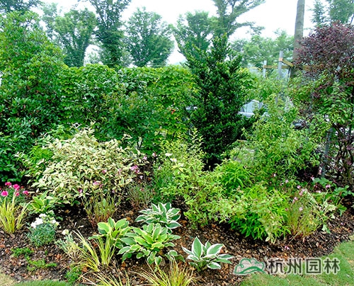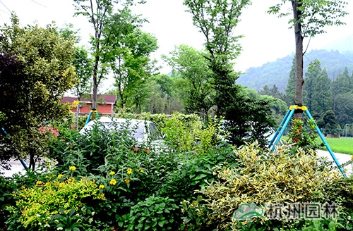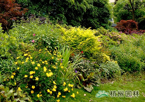 易豐女貞是杭州園林自主研發(fā)的新品種,葉片黃綠相間,在花境中可用作中景及后景材料。