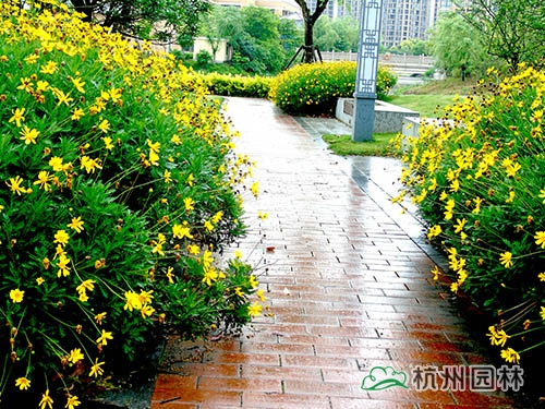 黃金菊長(zhǎng)到一定高度易彎曲呈拱形,在路緣花境中可借助其這一特性使其枝葉、花朵垂落在地面上,形成夾道歡迎的熱鬧趣味。
