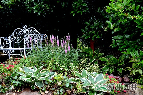 英式花境中,以穗花婆婆納為焦點(diǎn),通過(guò)花葉玉簪、礬根、檸檬羅勒、紅尾鐵莧、花葉絡(luò)石的配置,并與鐵藝座椅形成愜意的休閑氛圍。