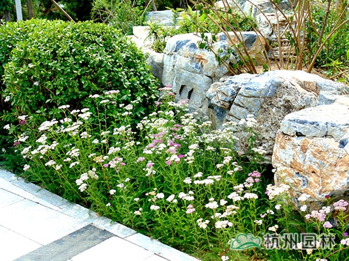 蓍草的傘形花序,配上柔軟的豎向枝條,易在風(fēng)中搖曳,野趣橫生。其在堅(jiān)硬的置石、石質(zhì)小品旁,均能各自成趣。