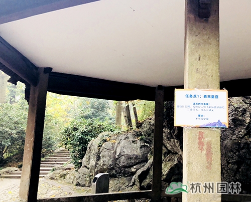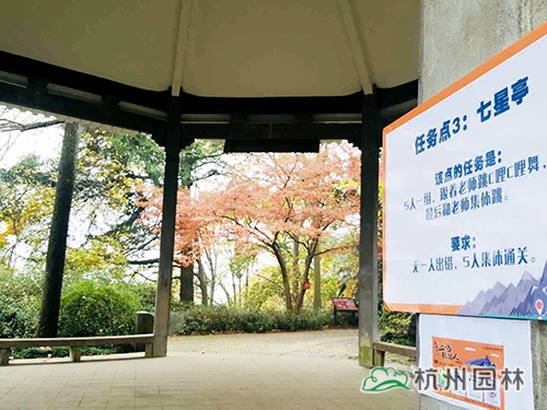 本次活動(dòng)的終點(diǎn)為玉皇山頂?shù)摹敖挥[閣”。玉皇山是杭州絕佳的觀秋景高地,站在山頂,可俯瞰杭州全城,八卦田的神秘、西湖的絢麗等盡收眼底;山上則是古樹(shù)參天,紅葉似火,黃葉賽金,彩林岑巒疊峰,如入畫(huà)里。大家從玉皇山北門(mén)上山,途經(jīng)林海亭、老玉皇宮、櫻花地、紫來(lái)洞天、七星亭,最后到達(dá)山頂?shù)摹敖挥[閣”。此次登山途中設(shè)立了3個(gè)任務(wù)點(diǎn),參加活動(dòng)人員需要完成相應(yīng)任務(wù),才能蓋章通關(guān)。