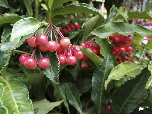 硃砂根的紅果期6個(gè)月以上,且株型優(yōu)美,四季常青,紅果艷麗,圓滑晶瑩,與綠葉形成強(qiáng)烈對(duì)比,鮮艷奪目,火紅果實(shí)給人以溫馨、熱情的美感,增添了喜慶、富貴的氣氛,觀賞性極強(qiáng),是優(yōu)良的觀果觀葉花卉。