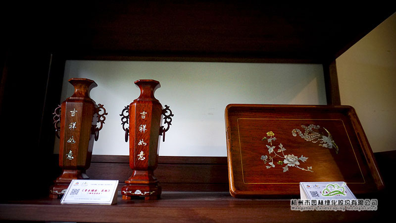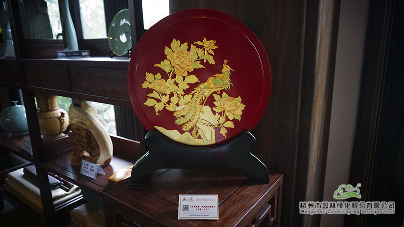 在浙江園的富春山居內(nèi),泥金彩漆、骨木鑲嵌、金銀彩繡等非遺展品也一并展出。泥金彩漆是寧波傳統(tǒng)的“三金”工藝之一,現(xiàn)主要分布于寧波市及其周邊地區(qū)。而骨木鑲嵌則是在木器表面嵌入動物骨骼進行裝飾,也是寧波的一門特色手工藝。金銀彩繡則是在真絲面料上用各色彩線繡制、金線和銀線盤繡而成的漢族民間手工藝品之一。這些非遺展品展現(xiàn)了寧波深厚的文化底蘊與人文精神。