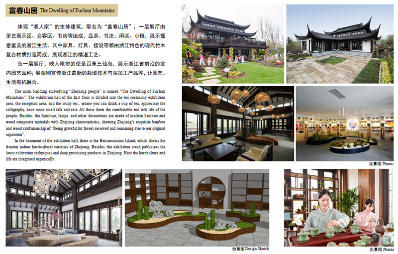 浙江園內(nèi)體現(xiàn)“浙人家”的主體建筑取名為“富春山居”,該建筑以浙派民居為原型,飛檐翹角,格局大氣,盡顯浙江風(fēng)情。深化這個(gè)建筑單體,團(tuán)隊(duì)做了很多功課,花了許多心思,考察了許多浙江特色民居,在充分運(yùn)用現(xiàn)代建筑材料與結(jié)構(gòu)的基礎(chǔ)上,通過對(duì)浙江傳統(tǒng)民居建筑的經(jīng)典片段提取和抽象提煉,賦予這些元素和符號(hào)以新的意義,構(gòu)建出浙江傳統(tǒng)民居的新風(fēng)貌。它不是對(duì)傳統(tǒng)民居建筑的照抄照搬,而是繼承和創(chuàng)新,設(shè)計(jì)了一棟獨(dú)一無二的建筑。