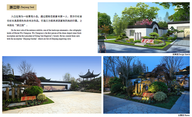 位于浙江園主入口西側(cè)的景觀小品“浙江印”,提煉自石鼓篆書第一人、西泠印社首任社長吳昌碩先生的書法作品,三方極具浙派篆刻風(fēng)格的印章上,“浙江園”三個(gè)字,干凈、利落,古樸、大氣。這幅美景的背后,是深化設(shè)計(jì)團(tuán)隊(duì)數(shù)次往返西泠印社,從無數(shù)的篆刻名家作品中挑選、比對(duì),決定采用最能代表浙江篆刻藝術(shù)的吳昌碩先生字體,從中找出“浙”、“江”、“園”三個(gè)字,在設(shè)計(jì)圖中反復(fù)比對(duì),調(diào)整位置、大小,最終確定下來。