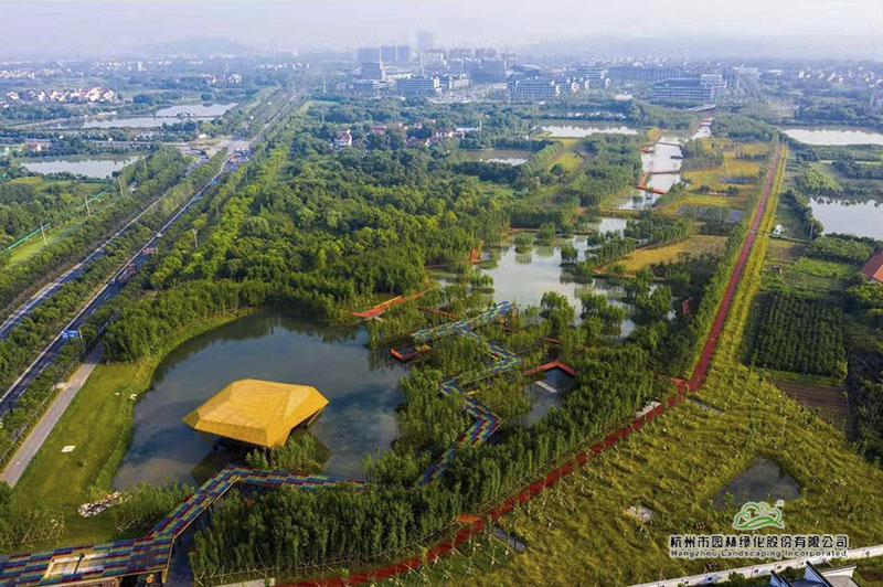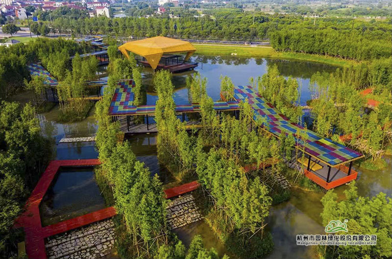 蘭溪市揚子江綠道長10公里,是杭州市園林綠化股份有限公司承建的揚子江生態(tài)公園中的一部分。綠道分為騎行綠道和景觀漫步綠道兩大部分,其中,騎行綠道沿公園兩側(cè)分布,鋪裝材料為透水混凝土;景觀漫步綠道圍繞園內(nèi)水系蜿蜒而行,鋪裝材料采用清水預制混泥土板。