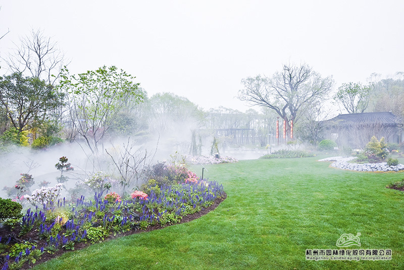 “延慶空氣干燥,而浙江園內(nèi)的植物,基本來自氣候溫潤的南方,因此,如何有效保水和增加空氣濕度,以此來提高植物的成活率和保證后期生長,是我們施工時(shí)必須要考慮的問題?!眳切〕烧f,“所以,園內(nèi)我們一共做了四套系統(tǒng),大樹根部的滴灌系統(tǒng)和樹上的噴灑系統(tǒng),大草坪的澆灌系統(tǒng),以及針對全園的霧森系統(tǒng)。”