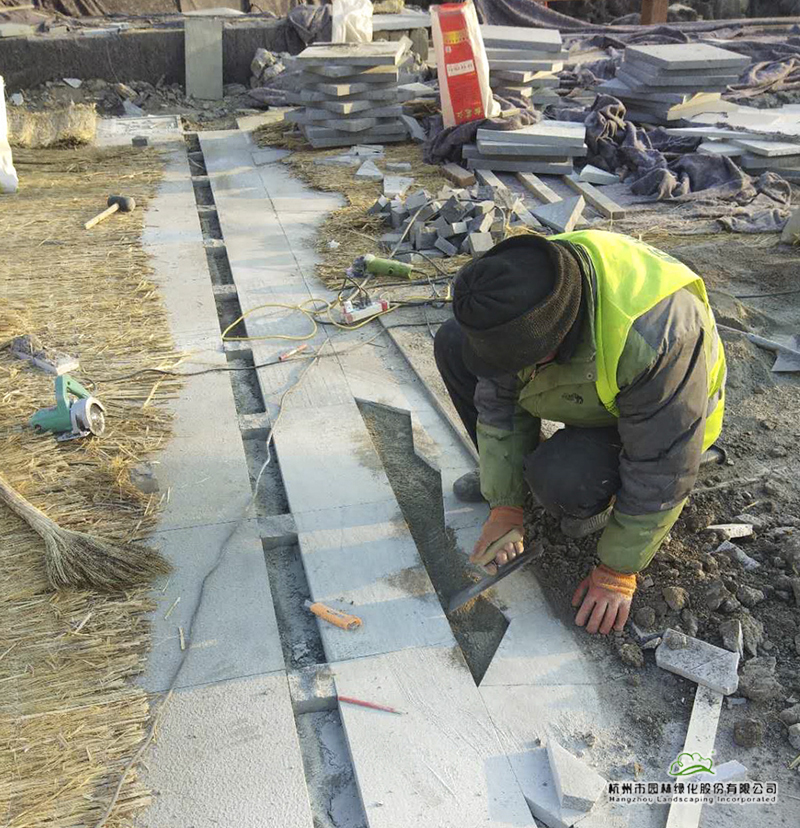 “白天溫度在零度以上時(shí),我們趁著太陽出來、溫度比較高的時(shí)候施工;等太陽快下山時(shí),溫度下降很快,這時(shí),我們就停止施工,用毛氈、草墊等將做好的鋪裝蓋起來,再搭上保濕棚保溫。因?yàn)槿绻E胧┳霾坏轿唬滋熳龊玫匿佈b,晚上就會凍壞,導(dǎo)致白天的工作功虧一簣。一些種好的精品樹木,如造型黑松,我們就用很厚的棉被包裹起來,以防凍傷?!被貞浧甬?dāng)初的施工過程,吳小成依然覺得這是施工中一段時(shí)常難熬的時(shí)期,“零下15℃的時(shí)候,我們還在施工,此時(shí)水已經(jīng)全部結(jié)冰,但施工又離不開水,怎么辦呢?我們買了一個(gè)加熱器,把冰放到桶里,再把桶加溫化水,以此來滿足施工中的用水需求。”