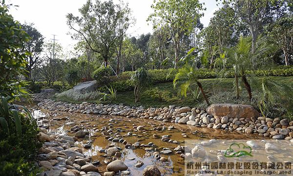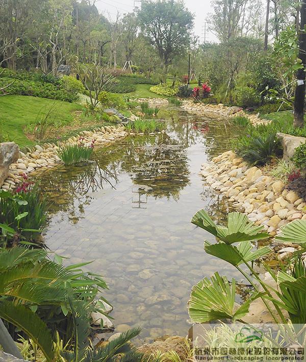 下雨時(shí)蓄水,用于植物的日常澆灌;干旱時(shí),鋪滿鵝卵石的水底又可與周邊豐富的植物營(yíng)造出另一種園林意境