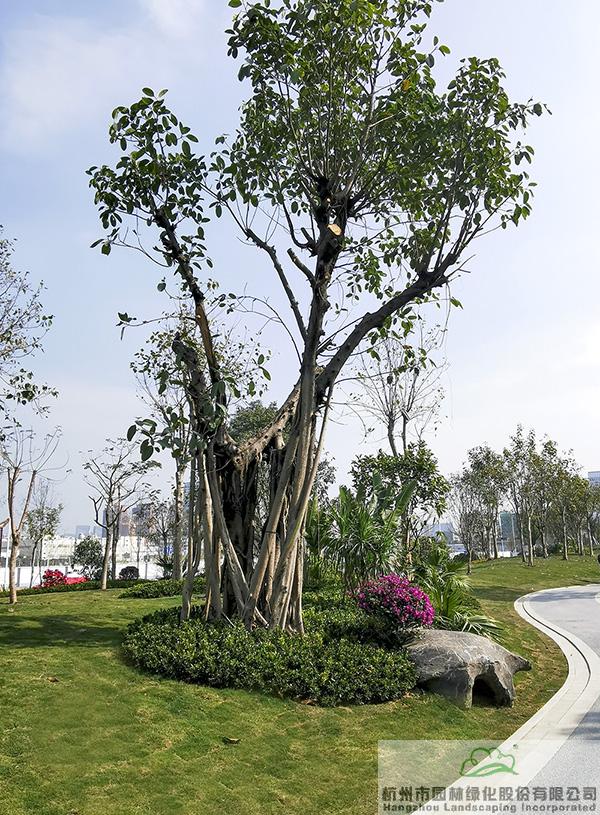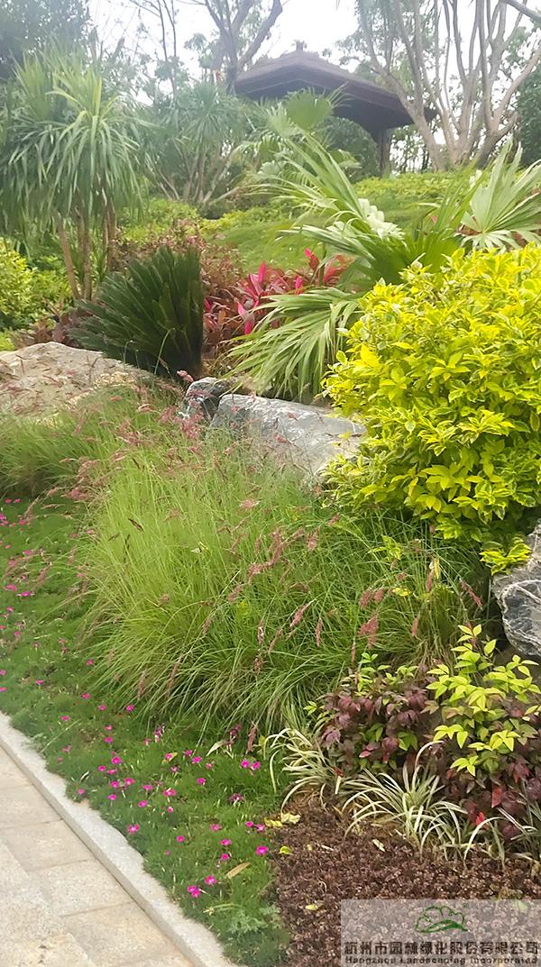 地被植物和小灌木充實(shí)園林的下層空間,往往起到“鑲邊”的效果,如果種植不好,很容易使底部出現(xiàn)裸露的土壤,景觀效果大打折扣。而該項(xiàng)目在現(xiàn)場(chǎng)放樣之后,先對(duì)地形進(jìn)行處理,形成一定的坡度,然后在地被植物或小灌木種植時(shí),上面坡度高的地方平種,隨著逐漸向下方邊緣靠近,植物種植向下方傾斜,逐步過渡,從上到下形成弧線,將土壤遮蓋?!斑@種處理手法,不但使下層空間看著自然美觀,而且避免了地面出現(xiàn)裸露情況。”葉偉華的言語中,不經(jīng)意間流露的,是杭園人對(duì)細(xì)節(jié)的極致追求。