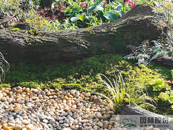 ①模擬苔蘚植物的生境條件,將蘚類濕地景觀與枯木結(jié)合,在枯木與卵石道路交叉部位布設(shè)小水塘,保持苔蘚生長(zhǎng)環(huán)境土壤濕度。
