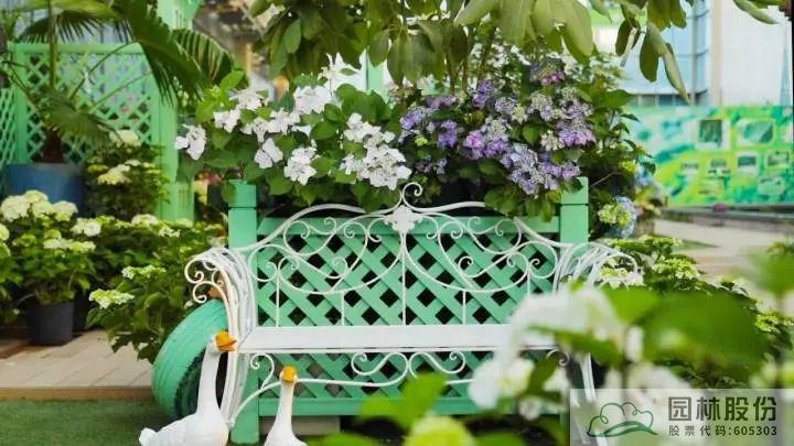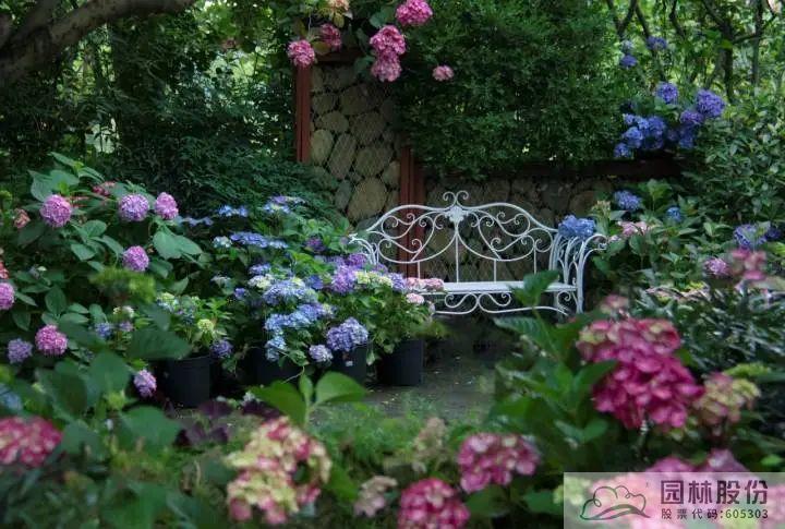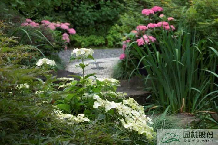 ▲園林股份自主選育的‘青山’系列繡球在畫(huà)境·青山湖花園中心室外景觀展示區(qū)中的應(yīng)用