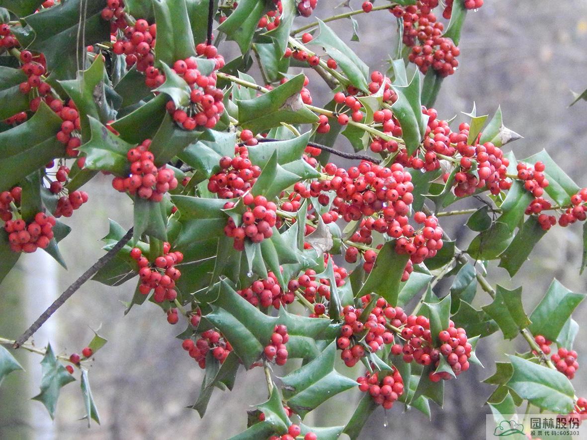 鐵冬青:其葉子四季常青,故名鐵冬青。為常綠喬木或灌木,高可達20米,葉全緣。果實紅色,紅若丹珠,小巧可人。掛果期長,能從10月一直持續(xù)至來年3月。因有多子多孫,興旺發(fā)達之意,在民間俗稱“萬子千紅樹”。樹皮或根皮為中藥“救必應”,具清熱解毒,利濕的功效。為優(yōu)良觀果樹種,適宜在園林中孤植或群植。