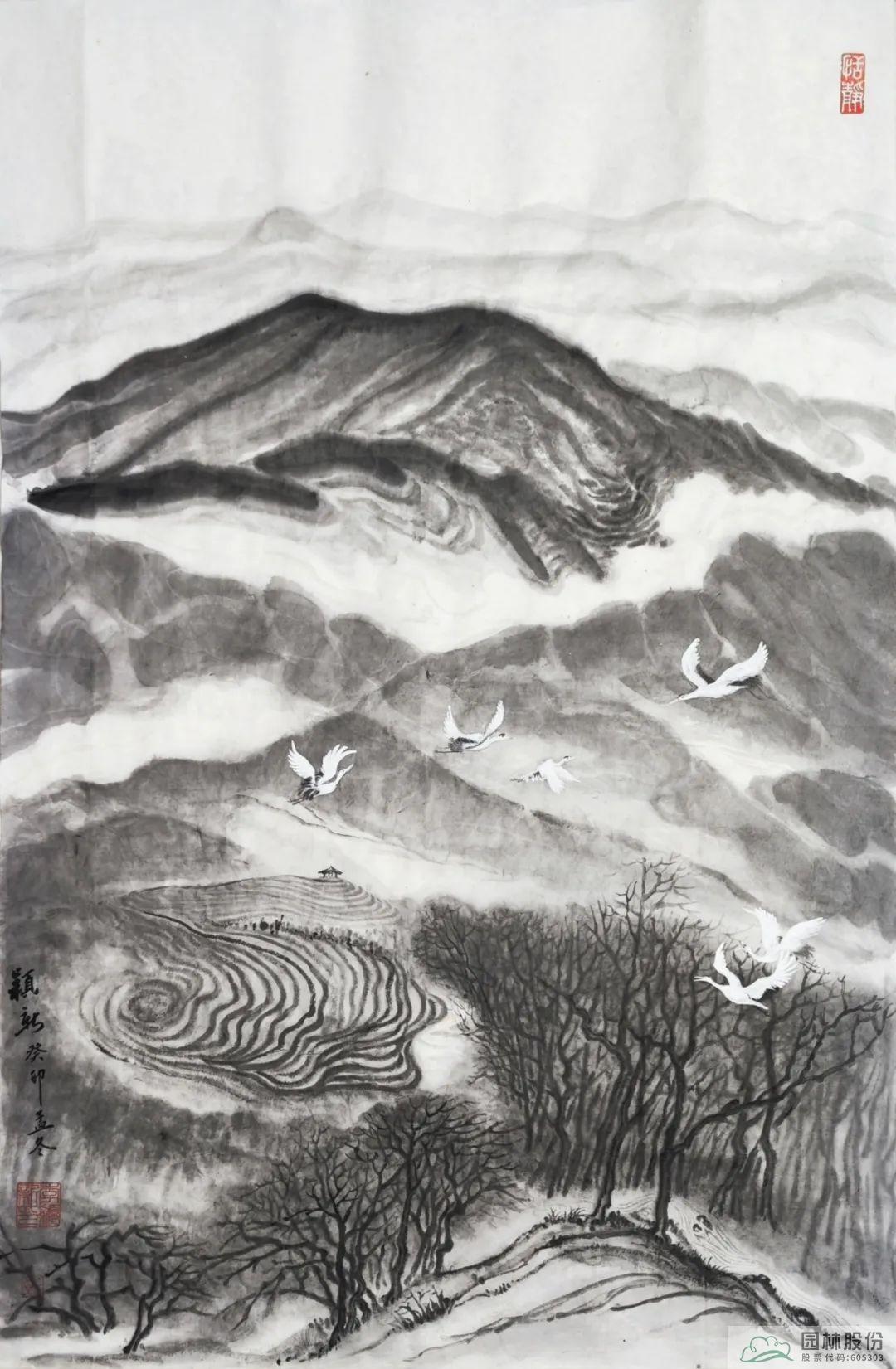 其中,杭州市園林綠化股份有限公司辦公室主任李穎新以徑山美景為創(chuàng)作內(nèi)容的書(shū)畫(huà)作品成功入選前20名。作品以杭州徑山及國(guó)家級(jí)美麗休閑鄉(xiāng)村-小古城村的自然景觀、鄉(xiāng)村風(fēng)情、茶園風(fēng)貌、翩翩白鷺等作為創(chuàng)作素材,主要表達(dá)在新時(shí)代背景下,隨著鄉(xiāng)村振興戰(zhàn)略的全面推進(jìn),一幅幅人與自然和諧共生的美麗畫(huà)卷正在神州大地徐徐展現(xiàn)。圖中山巒起伏、云霧氤氳、茶園連綿、溪水潺潺、白鷺紛飛……共同繪就一幅意境唯美的鄉(xiāng)村風(fēng)情畫(huà)卷,留下一段令人念念不忘的鄉(xiāng)愁記憶。