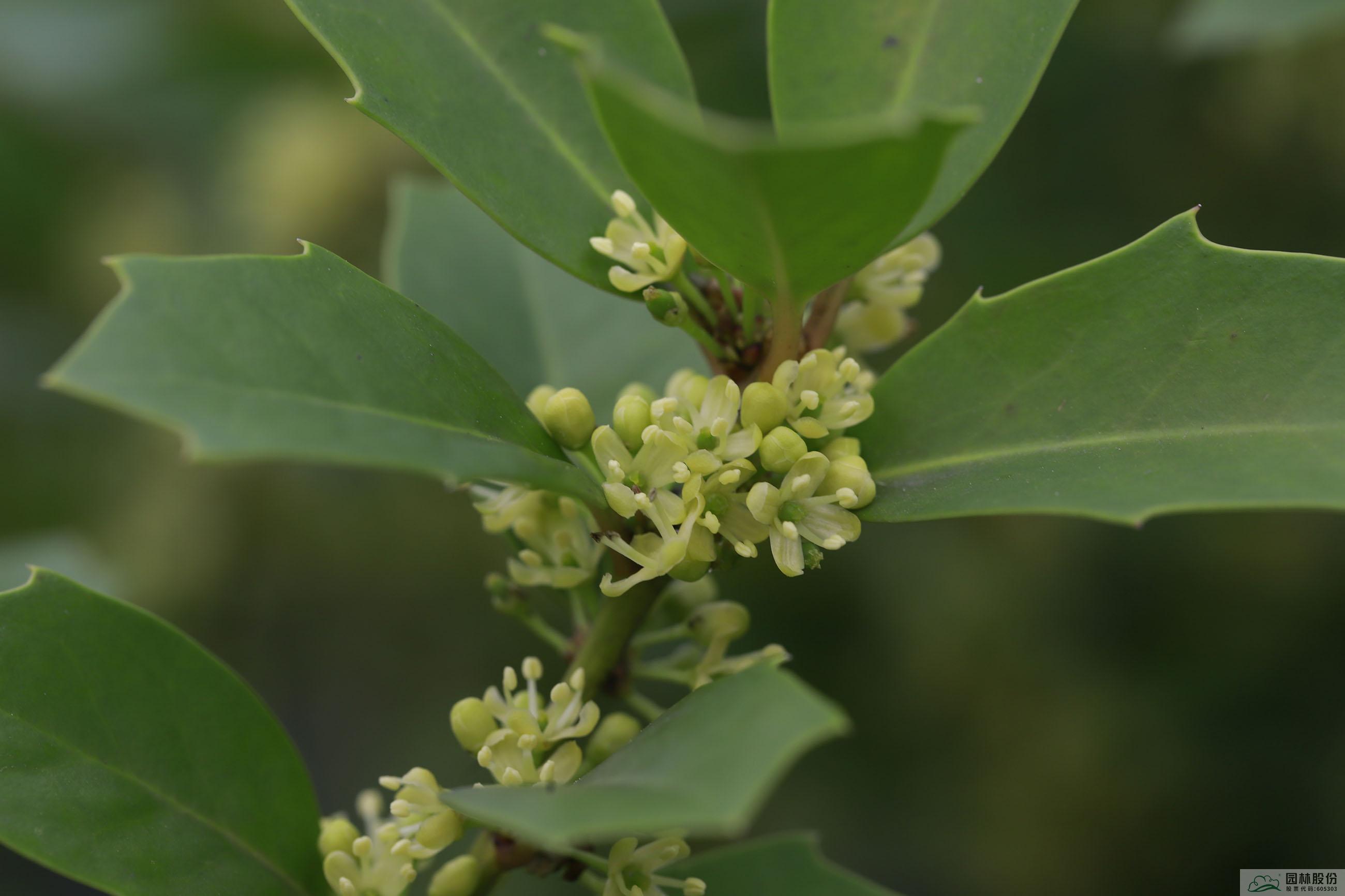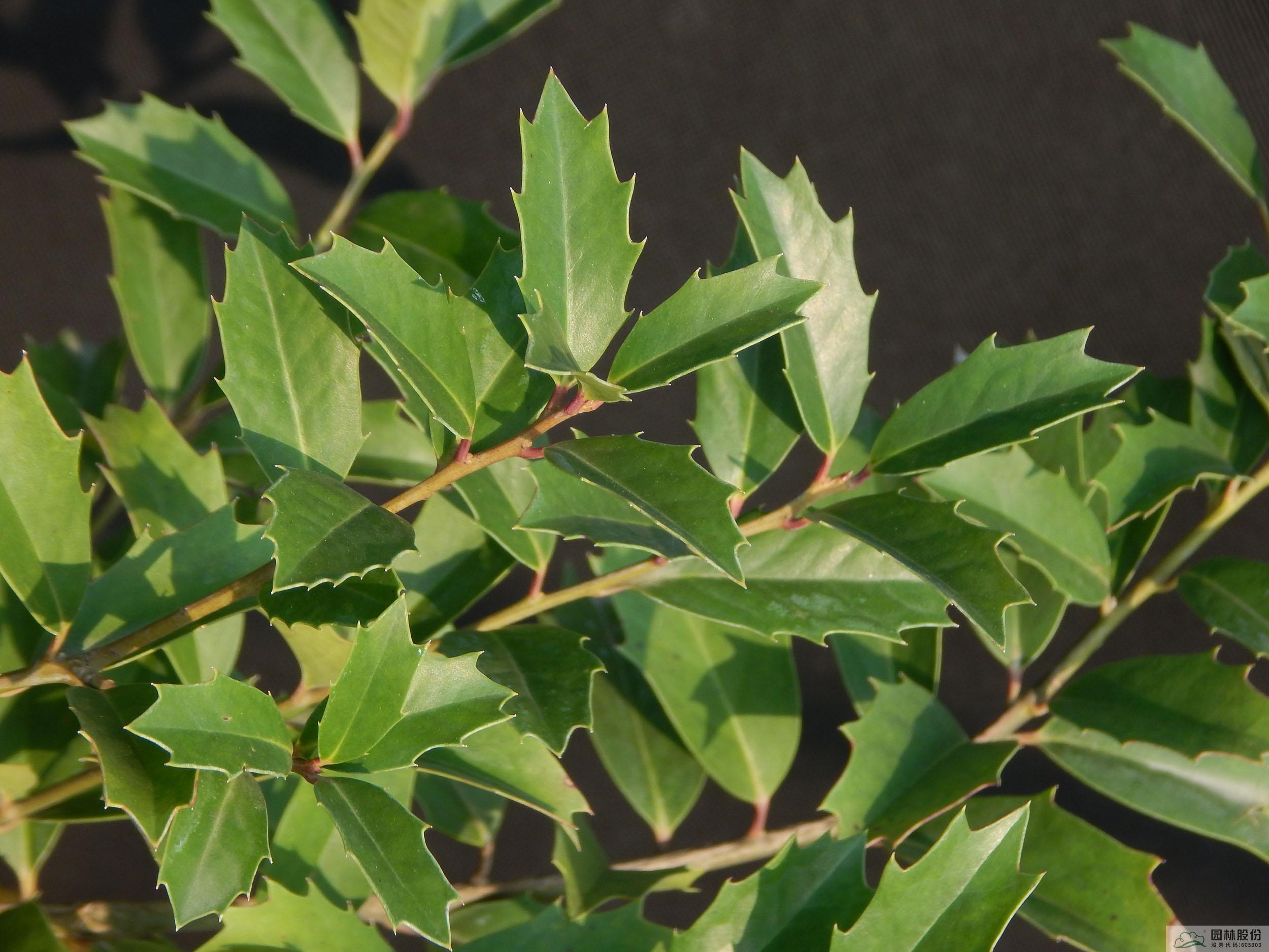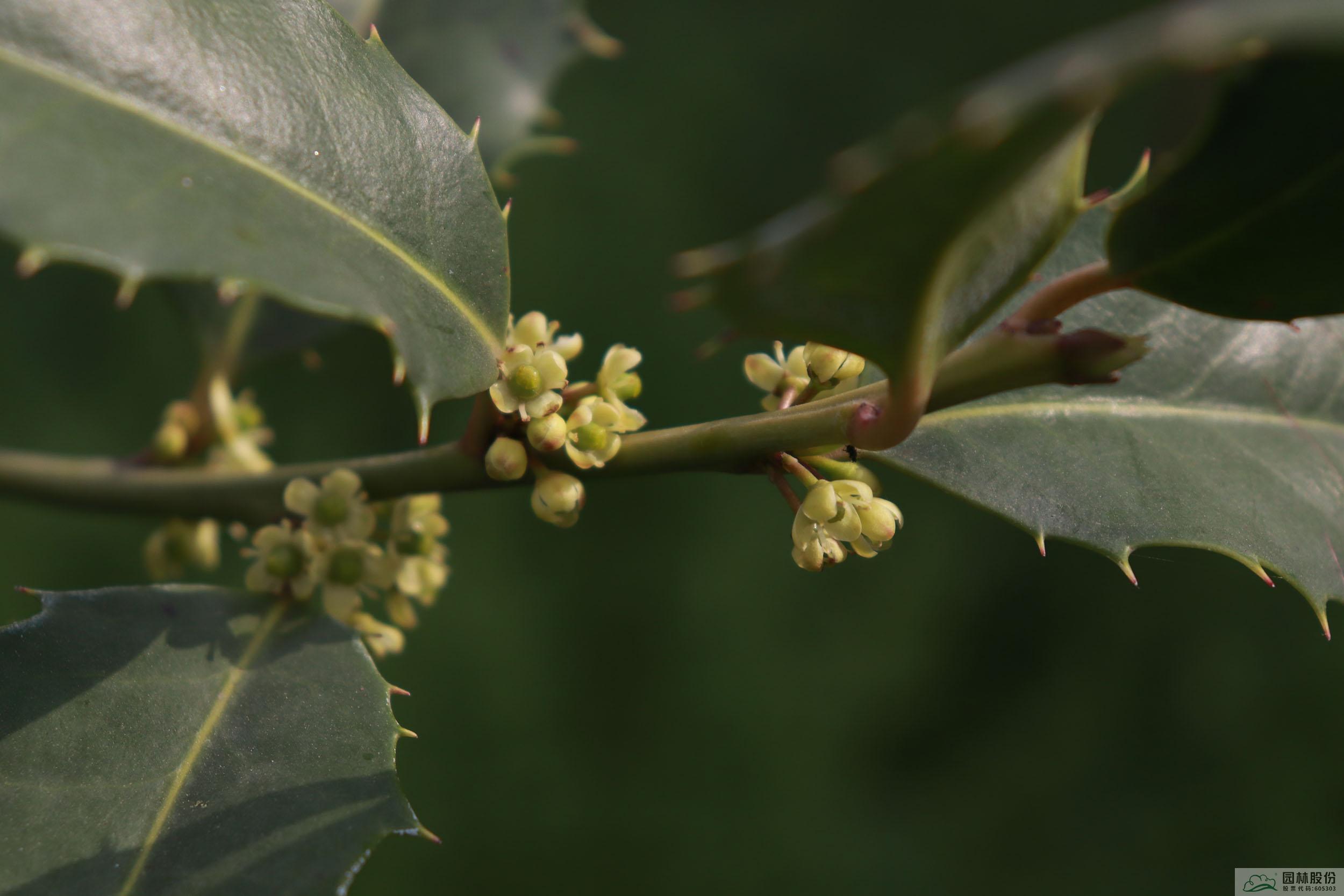 本品種為無刺枸骨Ilex cornuta ‘Fortunei’與全緣冬青Ilex integra種間雜交選育獲得。常綠喬木,雄株,植株圓錐狀。葉片厚革質(zhì),四角狀或不規(guī)則,先端漸尖,具一枚刺齒,葉柄紫紅色。雄花黃綠色,花期為4月中上旬。