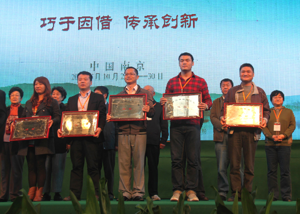 30日下午閉幕式的一個(gè)重要環(huán)節(jié)是為2011年度中國風(fēng)景園林學(xué)會(huì)優(yōu)秀園林工程獎(jiǎng)獲獎(jiǎng)單位頒獎(jiǎng)。由杭州市園林綠化工程有限公司承建的“昆明市市級黨政機(jī)關(guān)辦公用房搬遷建設(shè)項(xiàng)目區(qū)內(nèi)景觀綠化工程(第三標(biāo)段)”和“吳江市震澤鎮(zhèn)寶塔街西入口沿河、沿街北側(cè)、后花園仿古建筑工程”分別榮獲“中國風(fēng)景園林學(xué)會(huì)優(yōu)秀園林綠化工程獎(jiǎng)金獎(jiǎng)”和“中國風(fēng)景園林學(xué)會(huì)優(yōu)秀園林古建工程獎(jiǎng)銀獎(jiǎng)”。高總代表公司上臺領(lǐng)取了獎(jiǎng)牌。