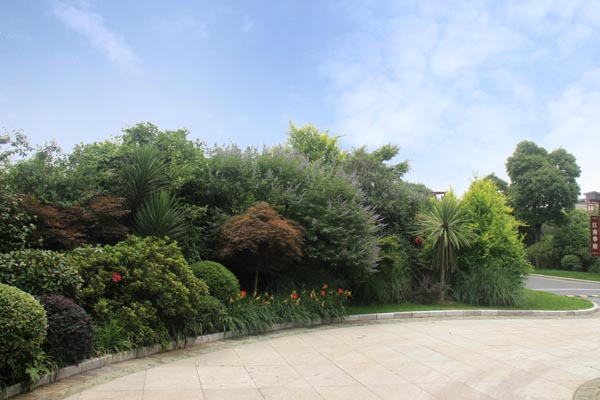 別墅小區(qū)公共景觀的植物配置不但要與建筑、環(huán)境相協(xié)調(diào),還要做到多層次、多樣化、多季相,并創(chuàng)造出植被生態(tài)景觀及其圍合空間的豐富多彩,達(dá)到人與環(huán)境的和諧統(tǒng)一,因此,植物的選擇與配置顯得尤為重要。據(jù)徐建良介紹,工程中的植物選擇與配置遵循三個原則:第一,根據(jù)地域特征,考慮季相變化;第二,根據(jù)建筑空間的大小、遠(yuǎn)近,近景或端景配置觀賞性強(qiáng)的品種,遠(yuǎn)景的植物配置則充分考慮空間天際線及建筑物之間的關(guān)系;第三,充分考慮林下植物和孤賞植物布置的各個方面,突出自然生長特征和人工修整造型植物之間的反差對比。以此為指導(dǎo),上層空間選擇了香樟、合歡、玉蘭、樸樹、銀杏等大規(guī)格喬木,中下層空間種植紅葉石楠、枸骨、杜鵑、鋪地柏、火棘等花灌木和地被,再配以微地形的處理,整個植物造景的林冠線、林緣線及空間層次別具特色,從而使得別墅區(qū)的整體景觀層次分明、色彩豐富,既在統(tǒng)一中富于變化,每個區(qū)域又自成風(fēng)格。特別是每個路口的花境營造,更為小區(qū)增添一抹亮色。