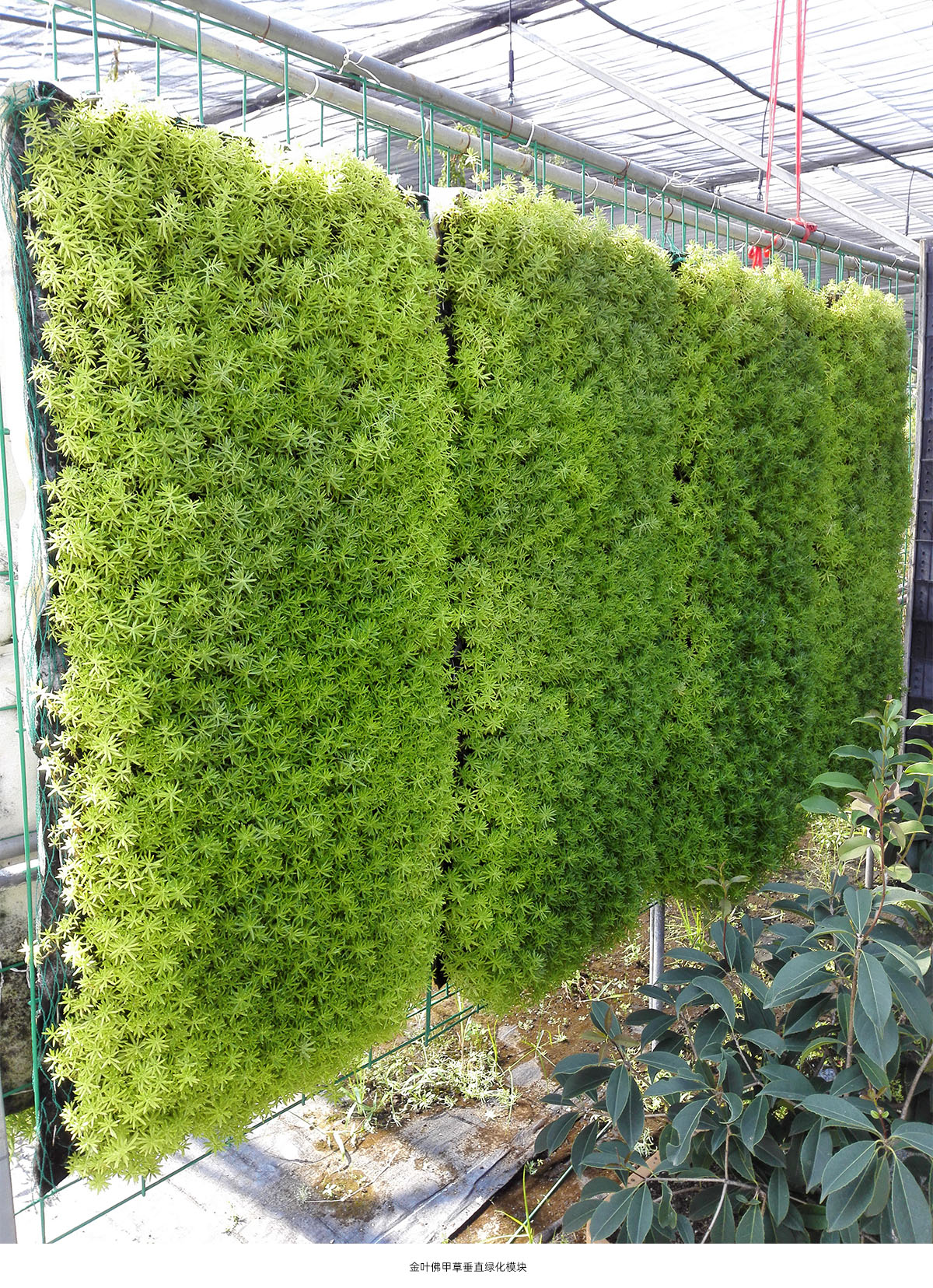 利用土工布、巖棉剪裁成一定規(guī)格與金葉佛甲草相結(jié)合,并運用工程技術(shù),制作出四季便攜式、輕型、降溫的金葉佛甲草垂直模塊。達到立竿見影的景觀效果且生產(chǎn)周期短的目的,有利于大規(guī)模推廣運用。